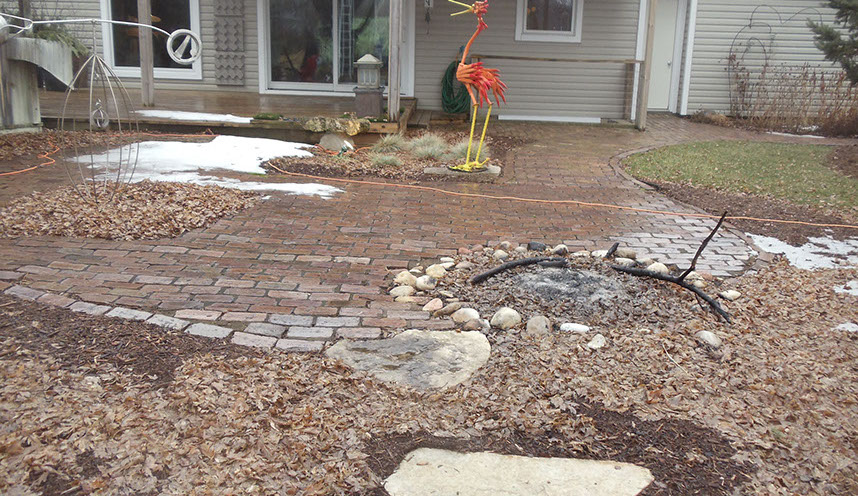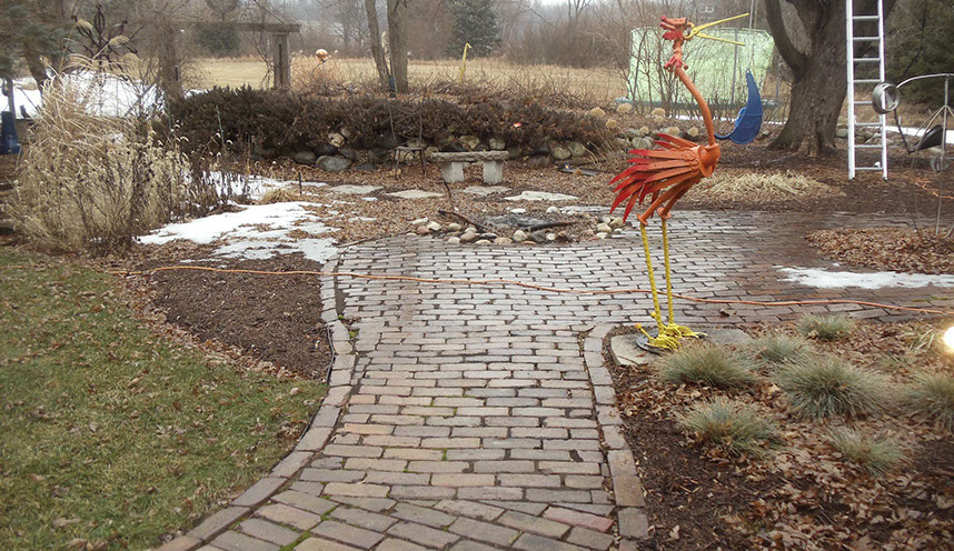 An expansive stamped concrete and brick patio provides plenty of space for a fire pit, dining area, and lounging. Outdoor lighting accentuates sculptures and unique plants throughout the landscape. Multiple stone paths lead to various gardens in the yard.