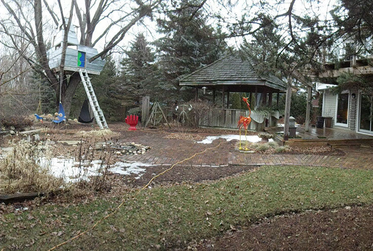 An expansive stamped concrete and brick patio provides plenty of space for a fire pit, dining area, and lounging. Outdoor lighting accentuates sculptures and unique plants throughout the landscape. Multiple stone paths lead to various gardens in the yard.