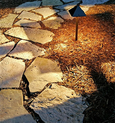 Low-voltage or line voltage lighting can make a property seem larger, create more curb appeal, and extend outdoor living into the evening hours. Up lights illuminate plants and architectural elements and statues. Path lights can create a safe environment and help navigate from one area to another.