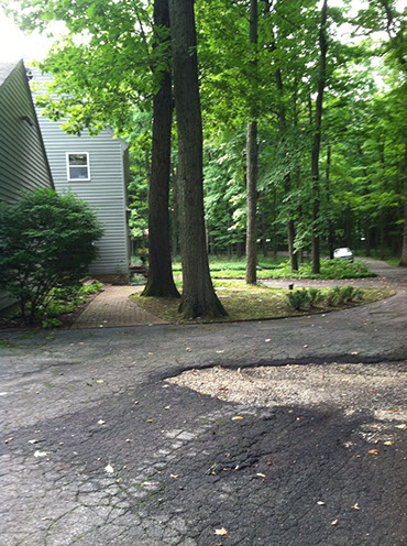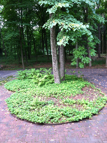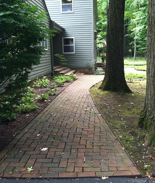 This Bluestone and reclaimed brick entryway edged in Lannon stone cobbles help create clean lines that contrast the surrounding woods. Masses of shade-loving plants provide color and texture to the entire property. A back yard secluded outdoor sitting room of bluestone and brick serves as an extension to the indoor living room.