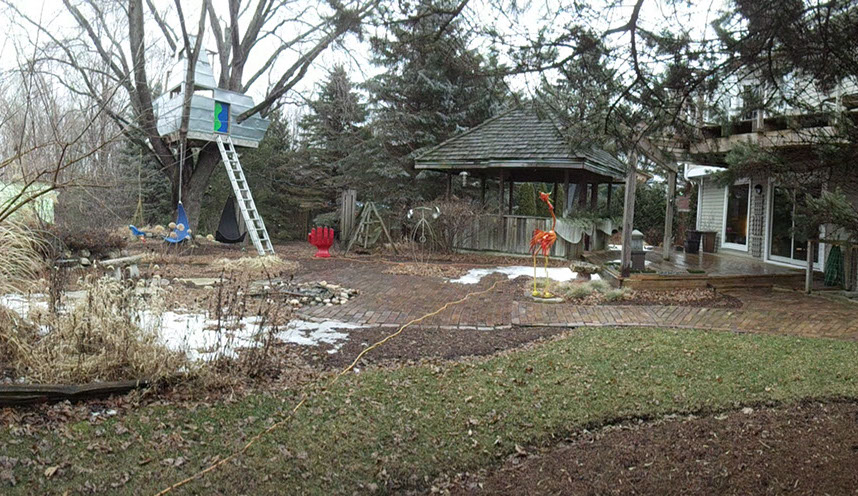 An expansive stamped concrete and brick patio provides plenty of space for a fire pit, dining area, and lounging. Outdoor lighting accentuates sculptures and unique plants throughout the landscape. Multiple stone paths lead to various gardens in the yard.