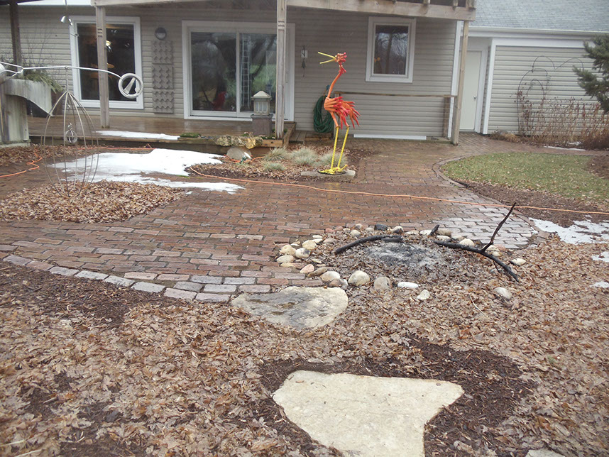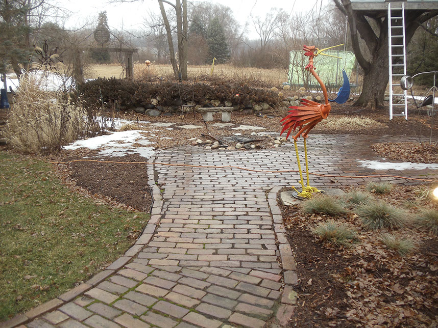 An expansive stamped concrete and brick patio provides plenty of space for a fire pit, dining area, and lounging. Outdoor lighting accentuates sculptures and unique plants throughout the landscape. Multiple stone paths lead to various gardens in the yard.