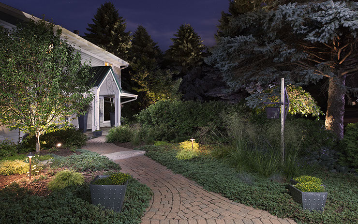 Low-voltage or line voltage lighting can make a property seem larger, create more curb appeal, and extend outdoor living into the evening hours. Up lights illuminate plants and architectural elements and statues. Path lights can create a safe environment and help navigate from one area to another.